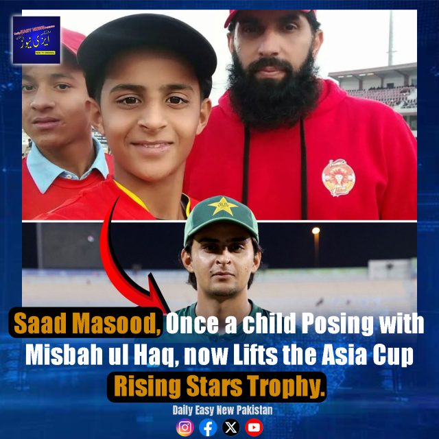Saad Masood, who as a child once posed with Misbah ul Haq, has now risen to glory by lifting the Asia Cup Rising Stars Trophy for Pakistan. His journey from a young fan to a national champion highlights dedication, talent, and the bright future of Pakistan cricket.