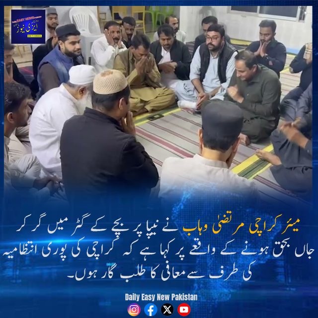 میئرکراچی مرتضٰی وہاب بچےابراہیم کےگھر جاکر بچےکےاہلخانہ سےدلی دکھ اور افسوس کا اظہارکیا۔ By Pak China - December 4, 2025 66 0 میئر کراچی کے ترجمان کے مطابق مرتضیٰ وہاب نے کہا کہ واقعے کی غیر جانبدارانہ تحقیقات کی جائیں گی جو بھی کوتاہی کا مرتکب پایا گیا اس کےخلاف کارروائی کی جائےگی اور مستقبل میں اس قسم کے واقعات سے بچاؤ کے لیے منظم اقدامات کیے جائیں گے۔