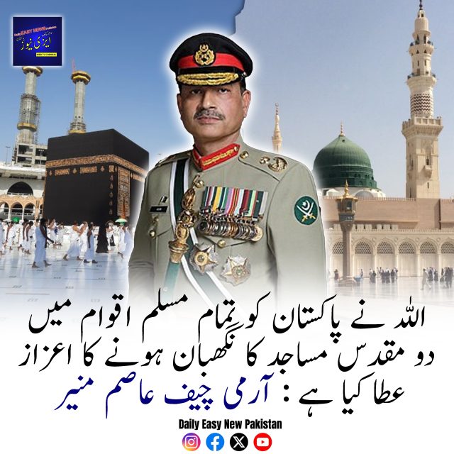 علماء و مشائخ کانفرنس سے خطاب کے دوران سی او اے ایس اور چیف آف ڈیفنس فورسز فیلڈ مارشل سید عاصم منیر نے کہا کہ پاکستان کو مسلم اقوام کے درمیان دو مقدس مساجد کے محافظ کے طور پر خدمات انجام دینے کا اعزاز حاصل ہوا ہے۔