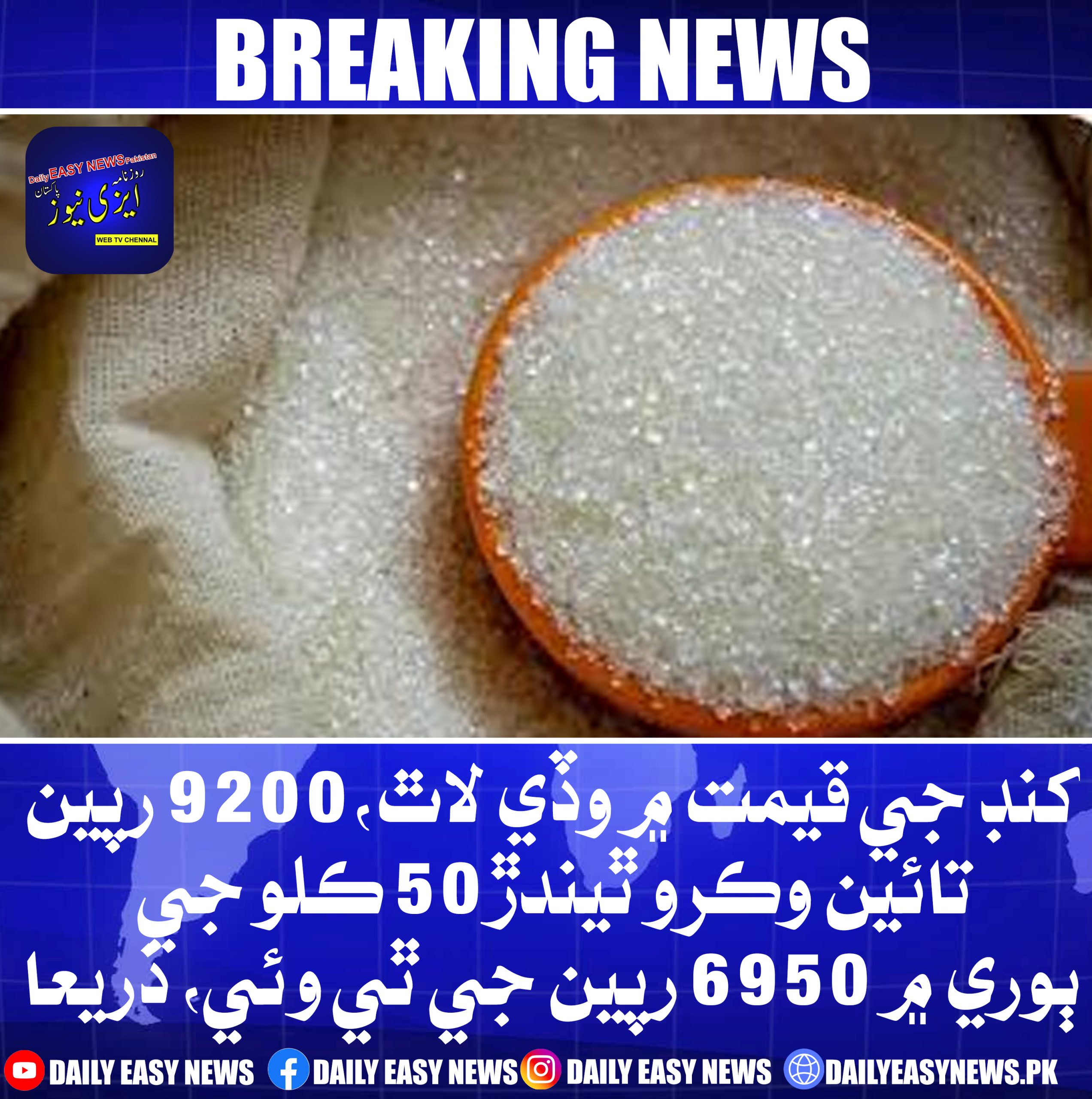 بريڪنگ نيوز By Pak China - December 21, 2025 253 0 بريڪنگ نيوزکنڊ جي قيمت ۾ وڏي لاٿ،9200 رپين تائين وڪرو ٿيندڙ 50 ڪلو جي ٻوري ۾ 6950 رپين جي ٿي وئي، ذريعا..!!