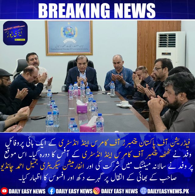 فیڈریشن آف پاکستان چیمبرز آف کامرس اینڈ انڈسٹری کے ایک ہائی پروفائل وفد نے ٹھٹھہ چیمبر آف کامرس اینڈ انڈسٹری کے آفس کا دورہ کیا۔ اس موقع پر وفد نے سالانہ میٹنگ میں شرکت کی اور انفارمیشن سیکریٹری جمیل احمد چانڈیو صاحب کے بھائی کے انتقال پر گہرے دکھ اور افسوس کا اظہار کیا۔