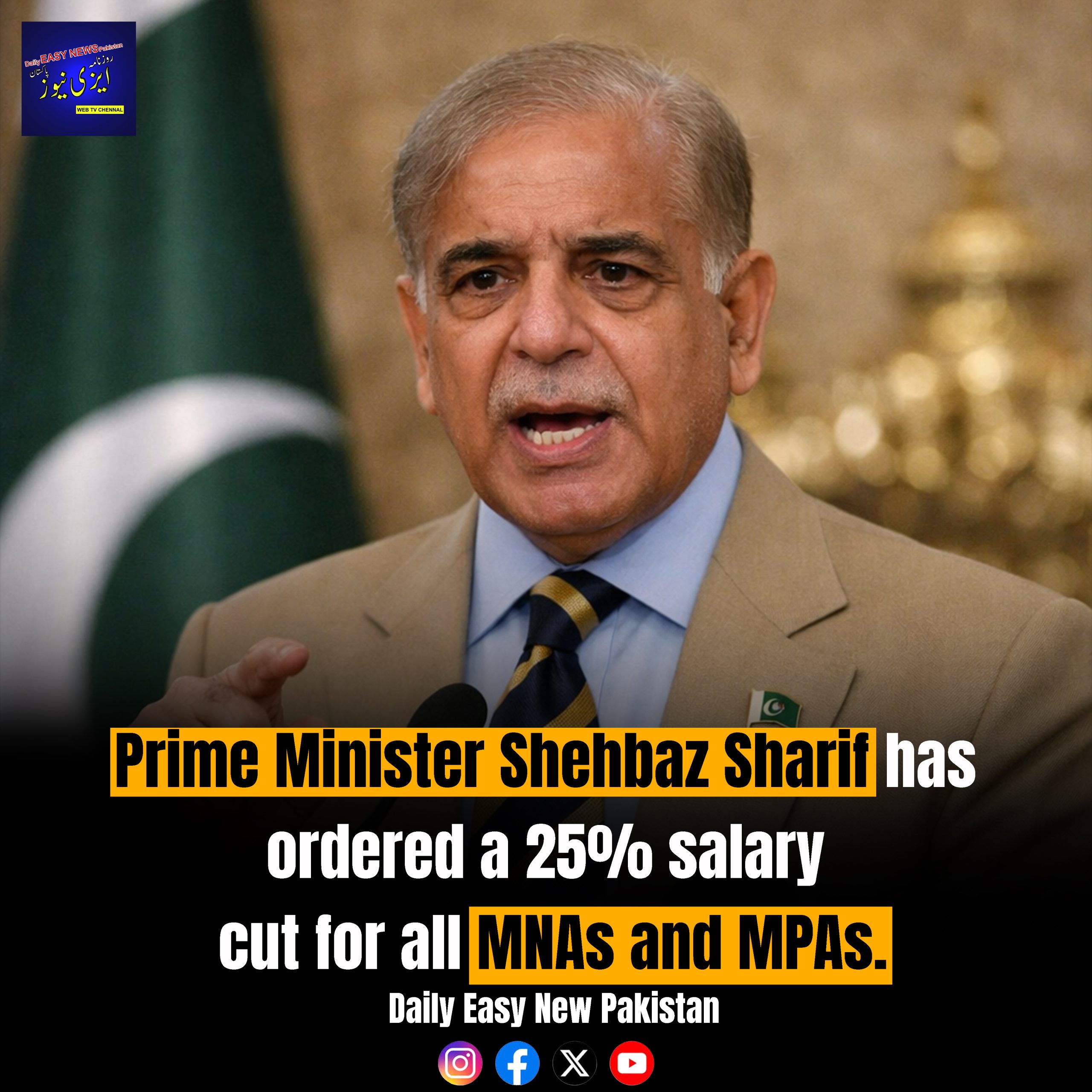 Prime Minister Shehbaz Sharif has ordered a 25% salary cut for all MNAs and MPAs.