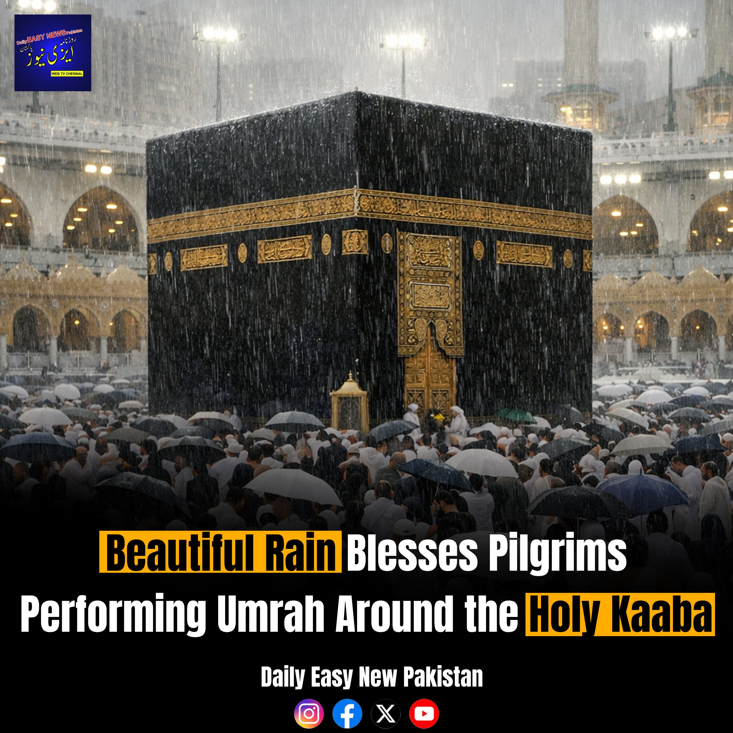 A gentle, beautiful rain shower graced pilgrims performing Umrah around the Holy Kaaba, creating a serene and spiritual atmosphere.