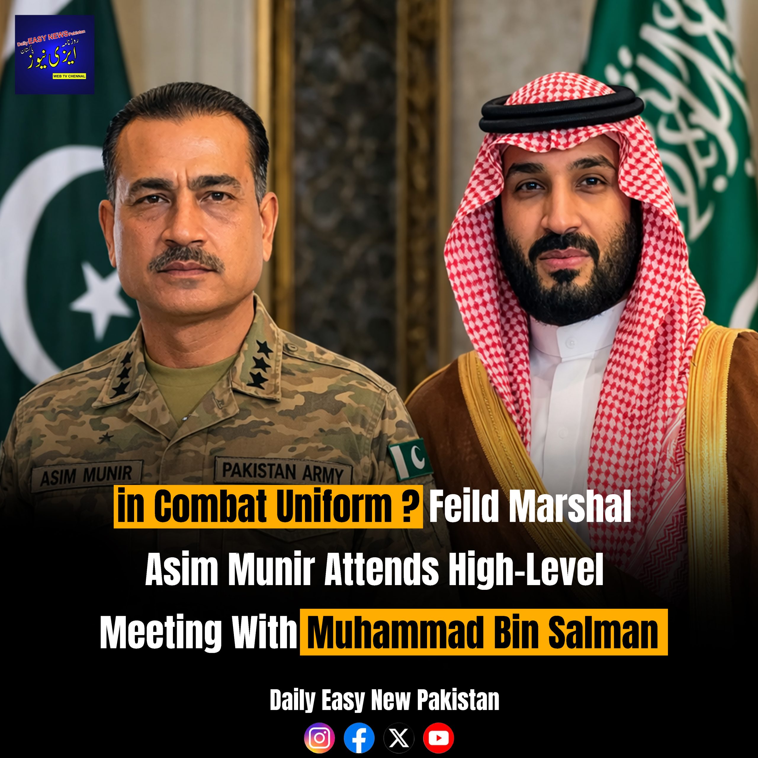 Field Marshal Munir was seen wearing Pakistan’s Combat Dress, highlighting the country’s unwavering solidarity with Saudi Arabia. This unusual choice of attire during a foreign visit underscores Pakistan’s commitment to support Saudi Arabia under their longstanding Mutual Defence Agreement.